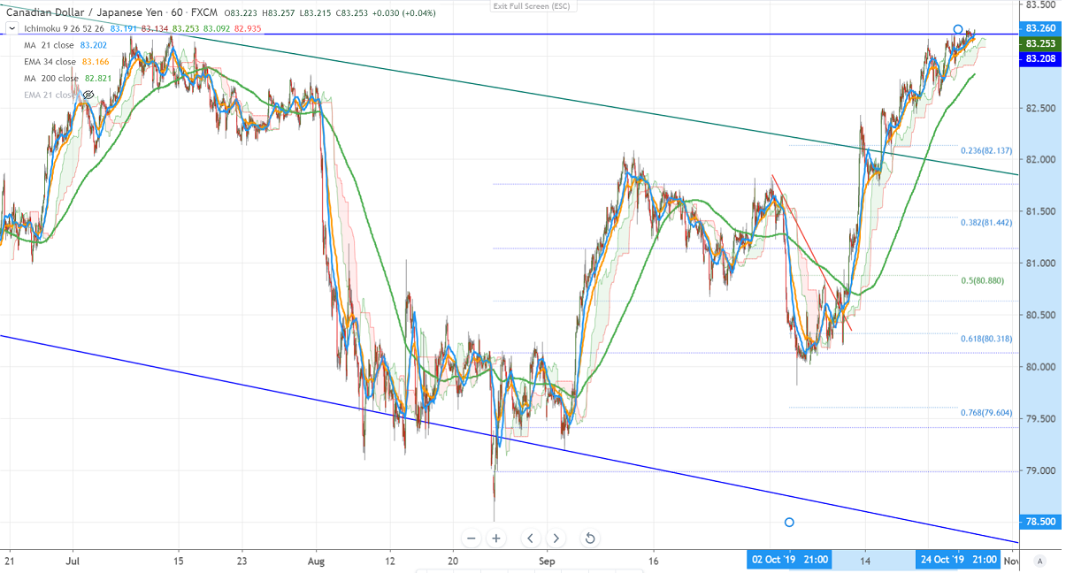 CADJPY is trading higher for the past 3- weeks and jumped more than 300 pips on the strong Canadian dollar. The Canadian dollar was one of the best-performing assets this month and jumped more than 250 pips against USD. The easing trade tensions have decreased demand for Safe-haven assets like yen. The pair hits high of 83.26 and is currently trading around 83.24.