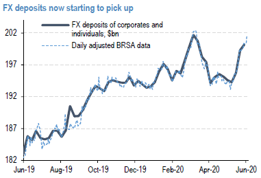 In TRY, we stay UW and added a 6-month USDTRY forward as we reckon BoP pressures are likely to prove key for lira’s outlook. Short-term external debt repayment needs remain high, although admittedly the rollover schedule is lighter over July-September. Portfolio outflows have reached $10.3bn YTD (see here) and while a recovery in global risk appetite is likely to slow non-resident selling, we believe portfolio flows are likely to remain subdued. Dollarization now appears to be picking up (refer above chart).