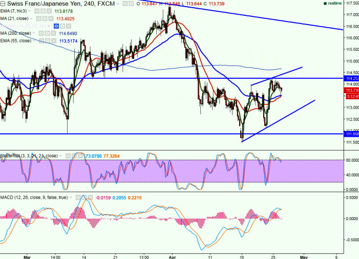 - The pair has retreated after making a high of 114.27 yesterday. It is currently trading at 113.71.