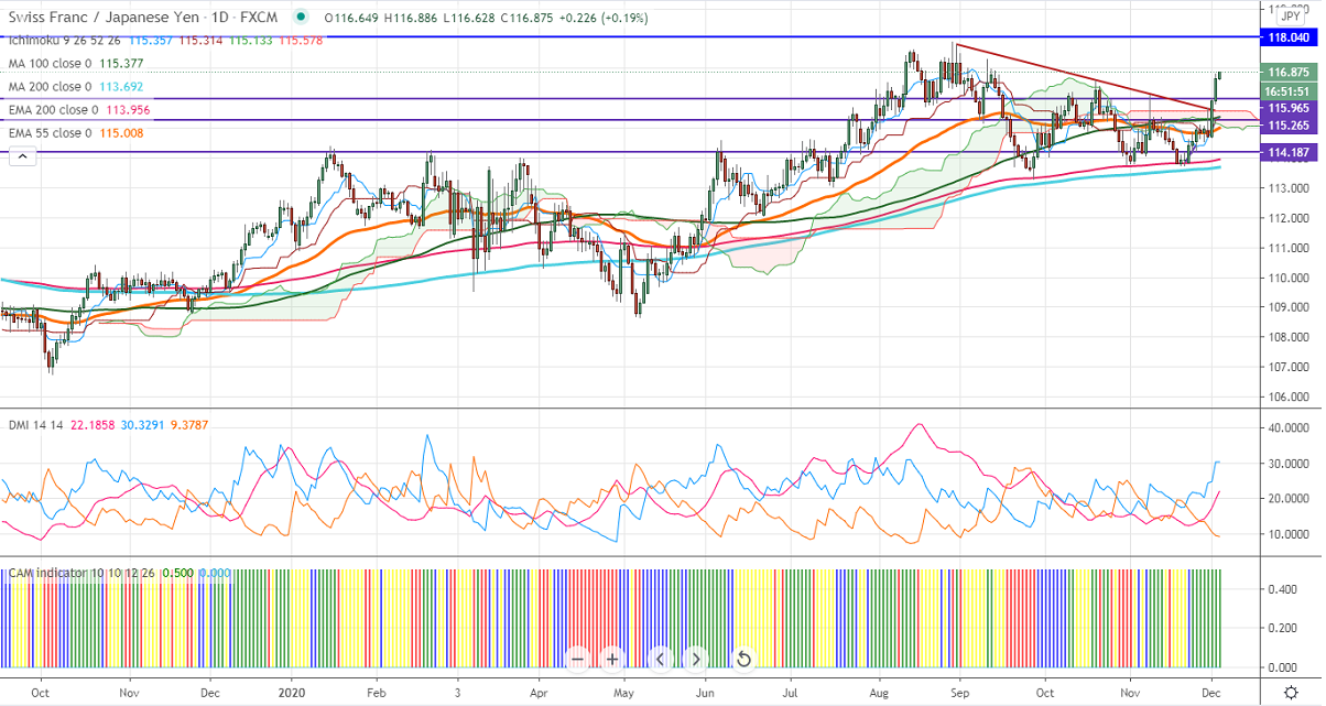 As per our analysis, CHFJPY continues to trade higher on the strong Swiss franc. USDCHF has broken 0.9000 and hits the lowest level since Jan 2015 on broad-based US dollar selling. The demand for safe-haven decreased after Russia to start mass vaccination next week. The Intraday trend of CHFJPY is still bullish as long as support 116 holds.