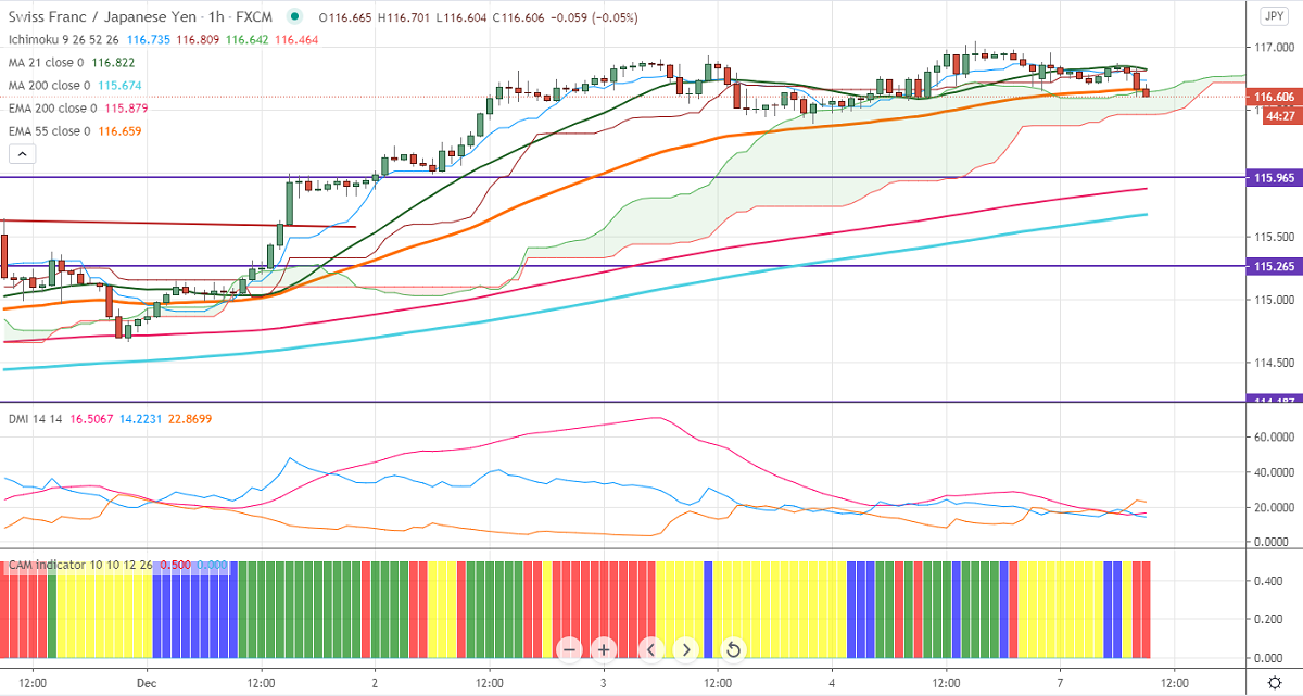 CHFJPY is consolidating after hitting a high of 117.04 levels. The intraday trend is neutral as long as support 116.40 holds. The minor pullback in USDCHF is putting pressure on this pair at higher levels. It has halted its three months of bearish trend and jumped more than 50 pips from a low of 0.88856. The Intraday trend of CHFJPY is still bullish as long as support 116.40 holds.