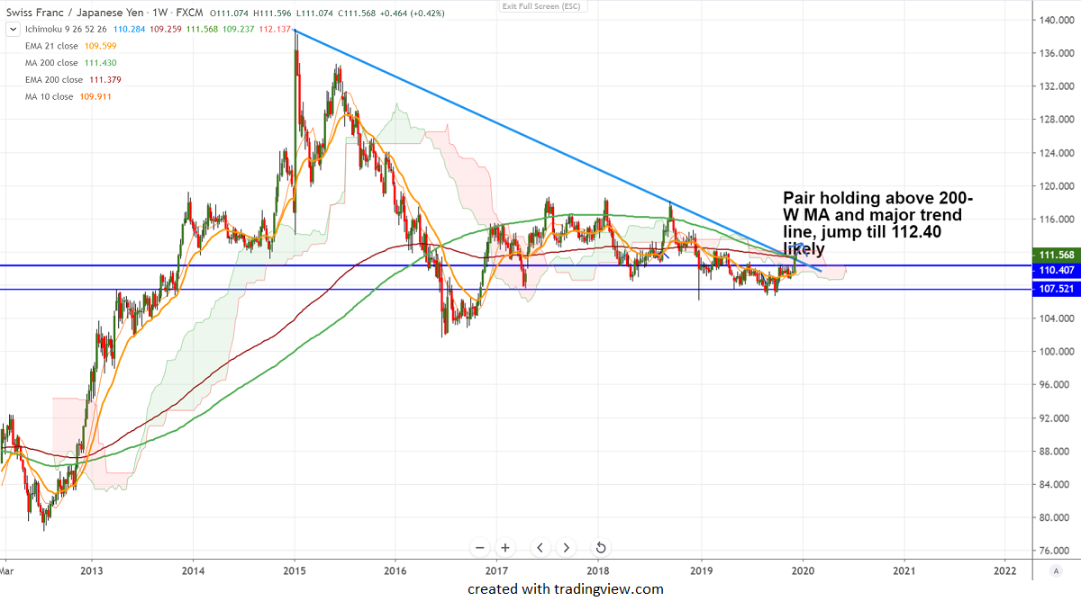 CHFJPY is trading for the 4th consecutive week and surged more than 300 pips on easing demand for Safe-haven assets like yen. The pair hits a high of 111.78 and is currently trading around 110.37.