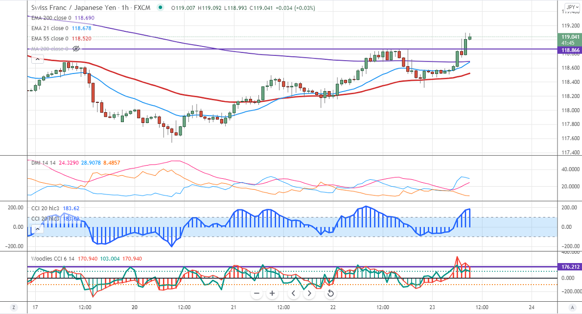 CHFJPY surged sharply after hitting a low of 118 on board-based Swiss franc buying. The global financial markets turmoil due to the Chinese Evergrande debt crisis has increase demand for Safe-haven like the Swiss franc. It hits an intraday high of 119.08 and is currently trading around 118.97.