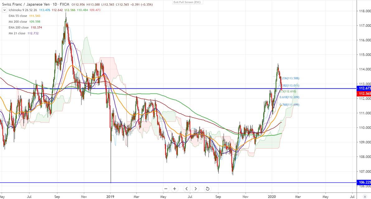 CHFJPY is trading for the past 5- days and lost more than 150 pips. The decline was mainly due to a slight recovery in yen on increasing demand for Safe-haven assets on the spreading of coronavirus in Asian countries. It hits an Intraday low of 112.70 and is currently trading around 112.57.