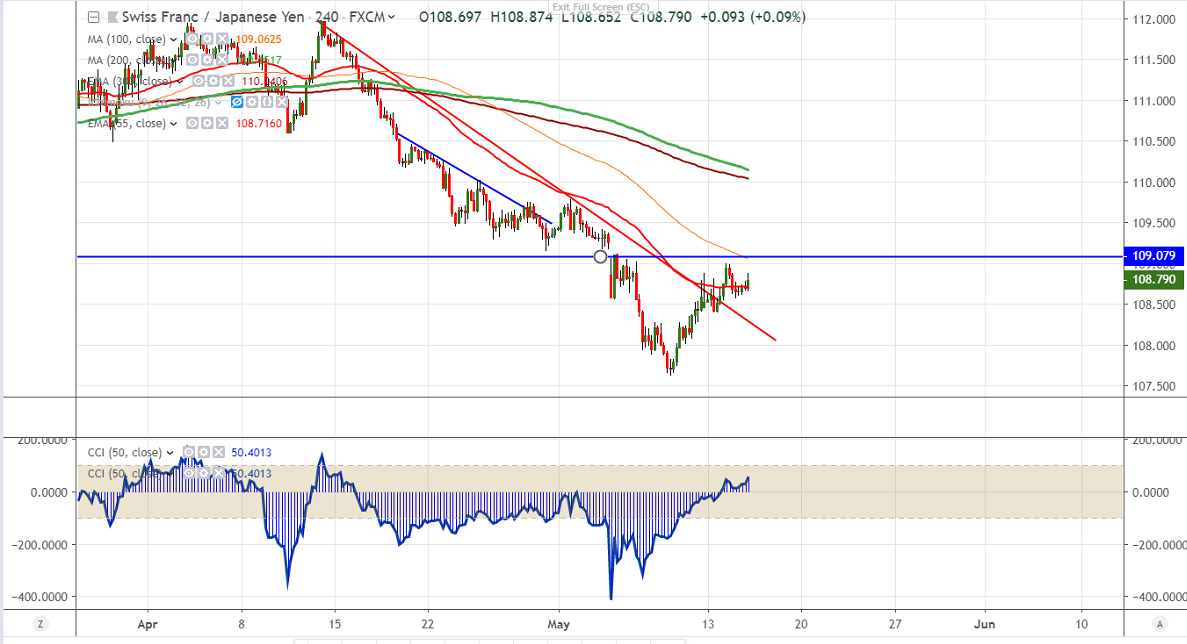 CHFJPY has formed a minor bottom around 107.61 and shown a more than 100 pips recovery till 108.99. the jump was mainly due to ongoing trade tension between US and China. US imposed tariff on $200 bn Chinese goods from 10% to 25% and to counter this China increased tariff of 5000 US products. This has increased demand of safe haven assets like gold,Swiss franc. It is currently trading around 108.75.