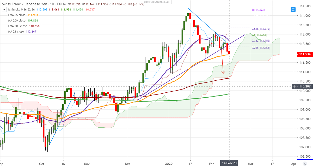 As per our analysis, CHFJPY is trading weak after a minor pullback to the 112.91 level. The pair has broken major support 112 after a long consolidation. The main reason was due to weakness in the Swiss franc, especially against USD. The overall trend is still weak as long as resistance 113.10 holds.