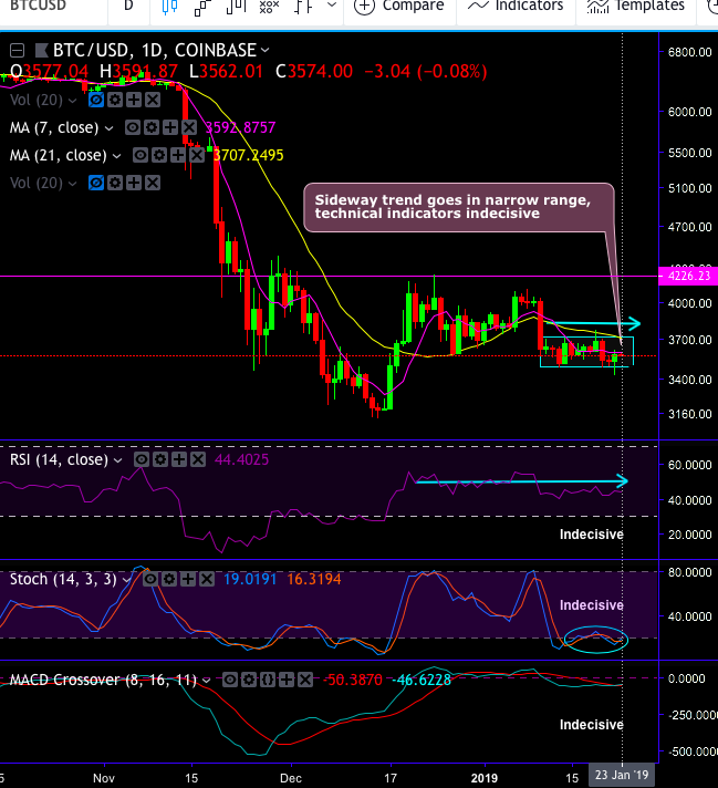 Of late, BTCUSD (at Coinbase), sideways trend goes in a narrow range, the current price trading at $3,575 levels, remains well below 7 & 21-DMAs.