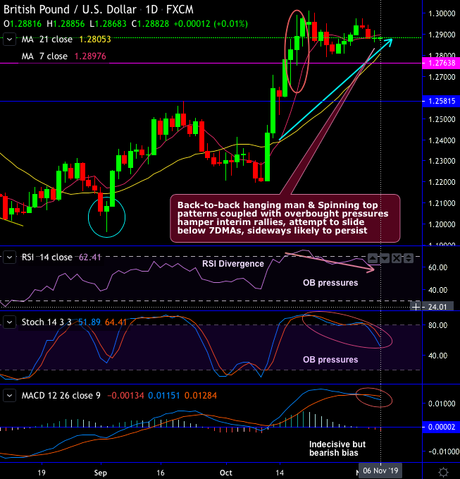 Back-to-back hanging man & spinning top patterns coupled with the RSI divergence and the overbought pressures hamper interim rallies.