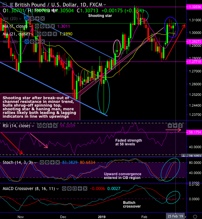Technical chart and candlestick patterns: GBPUSD (cable) formed spinning top, shooting star and hanging man patterns at 1.3049, 1.3035 and 1.3053 levels on daily plotting. The minor trend developed sloping channel previously but the interim bulls have broken out channel resistance. Bulls seem to be shrugging-off above-stated bearish patterns (refer daily chart).