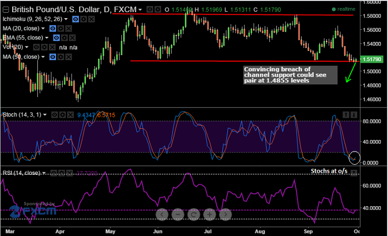 - On the flip side, support is seen at 1.5140 (channel base) and then at 1.5126 (Sept 29 Low), below which it could extend losses to 1.5100 levels