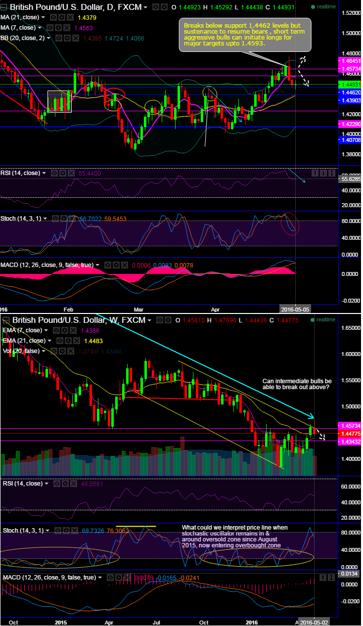 “Breaks resistance at 1.4573 levels but sustenance is questionable, but don’t jump into conclusion wait for confirmation, short term aggressive bulls can initiate longs for major targets upto 1.4645.”