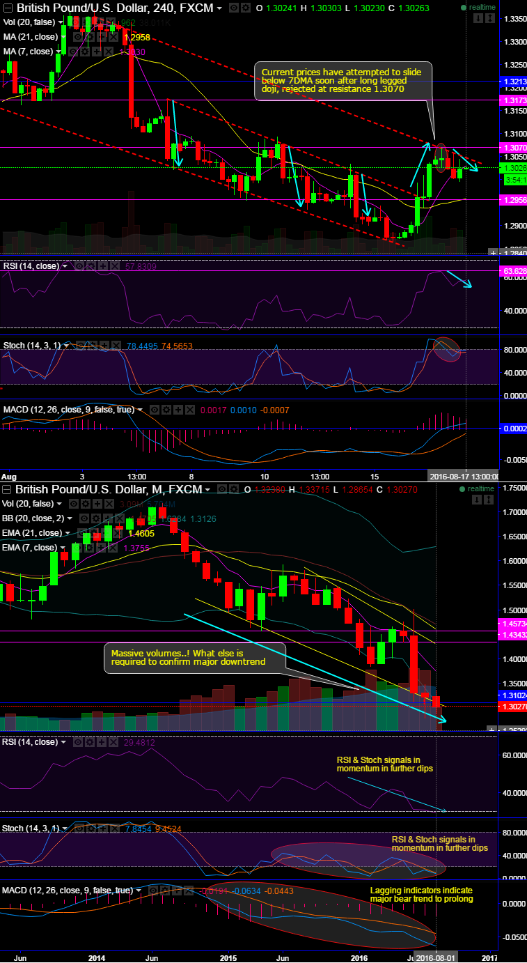 The current prices have attempted to slide below 7DMA soon after long legged doji, rejected at channel resistance 1.3070 (see 4H charts). After the rejection of resistance, we could see selling momentum is quite visible.