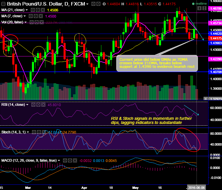 In addition to the above mentioned risky event, amid monetary policy season from both Fed and BoE that are scheduled in upcoming weeks, the pair has been tumbling below crucial supports at 1.4343 and 1.4152 levels with ease.