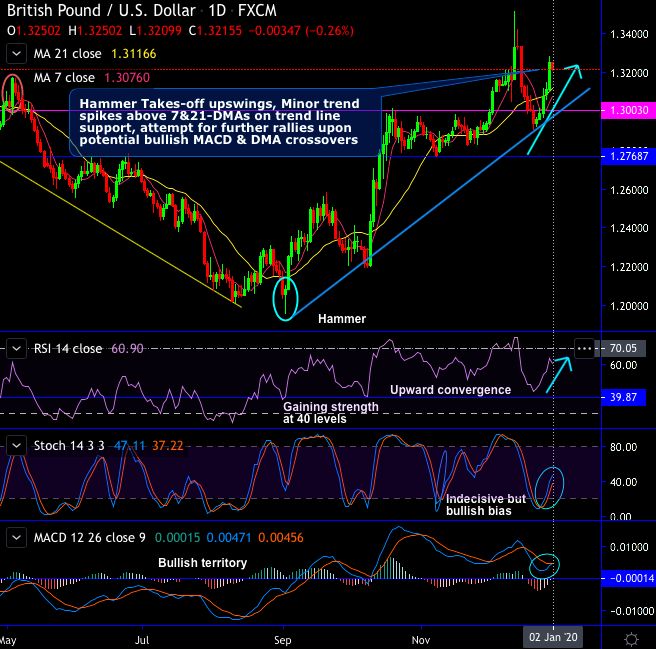 Cable (GBPUSD) after pulling back from recent peaks of 1.3514 during UK election result, the minor trend has taken trend line support and spikes above 7&21-DMAs, Hammer pattern candle occurred at 1.2082 levels to bottom-out spurs intensified upswings.
