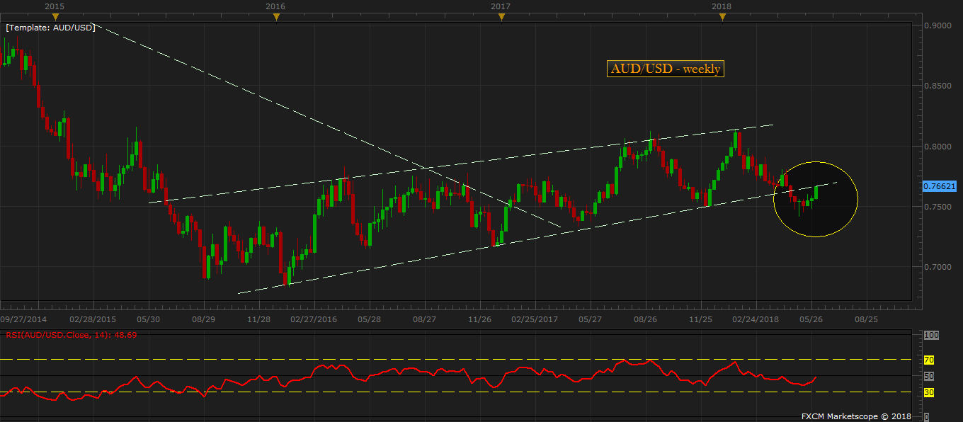 The above weekly chart of the AUD/USD clearly shows that Australian dollar has decisively broken below its rising range that has been in place since 2015. In the last to last week of April, it broke below the range instead of a bounce back and has so far stayed below.