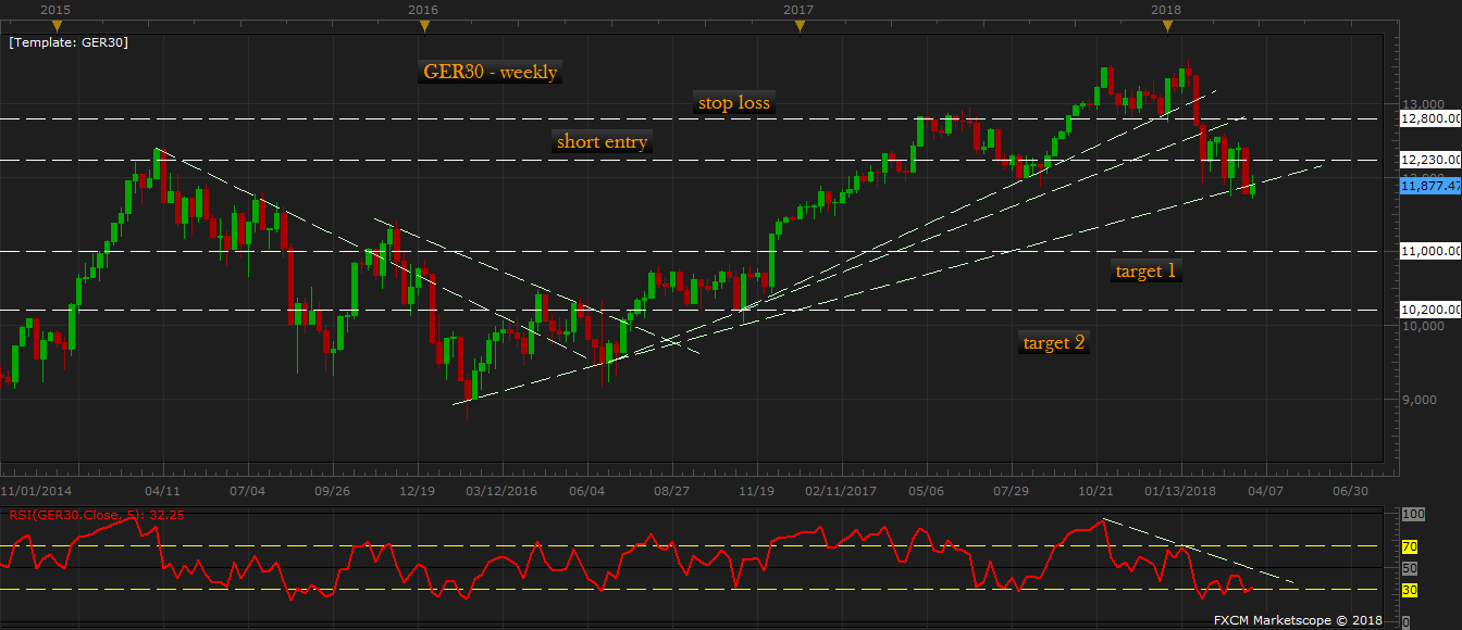 In this article, we would like to extend our short side target for the GER30 from the current 11,000 to 10,200 based on our latest calculations. We would also like to revise the stop loss from current 13,600 to 12800 area.
