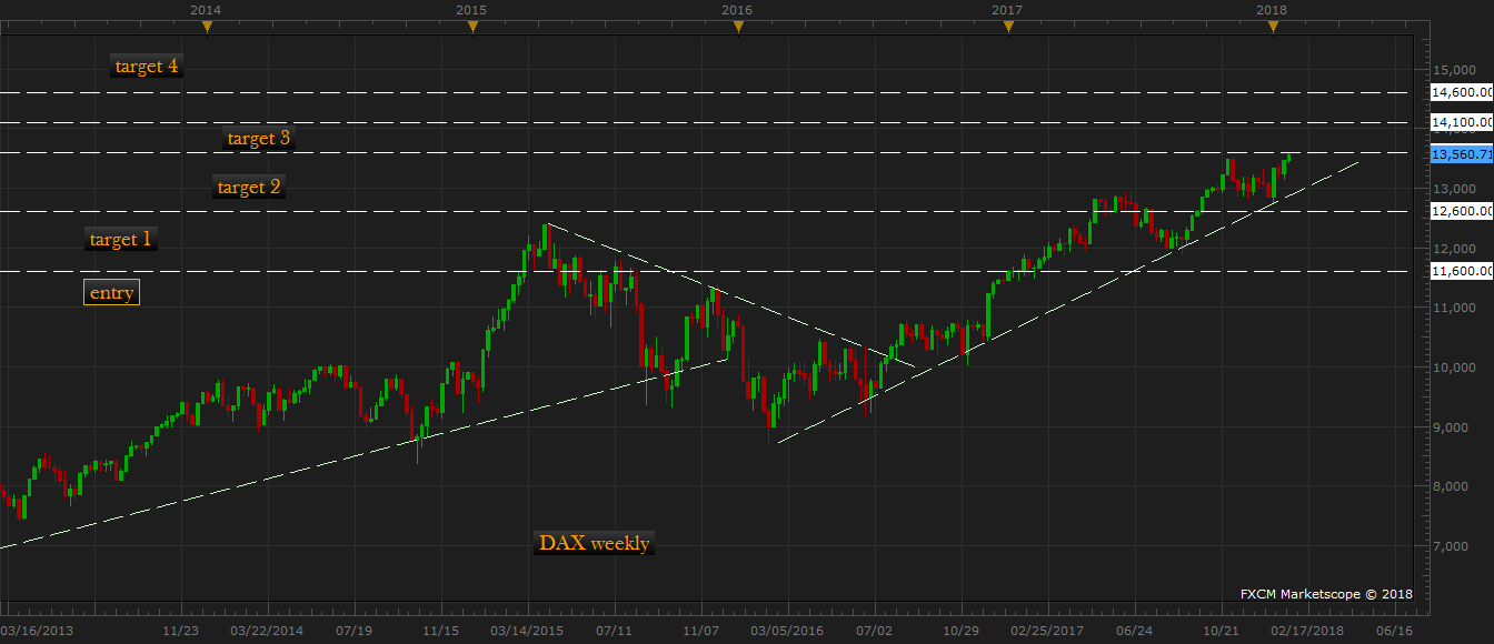 We believe that DAX is still quite undervalued compared to S&P500 (taking into account the U.S. tax reforms). Hence in this piece, we would like to extend the target for DAX from 14100 to 14700. Note, that returned would be higher for foreign investors if the euro’s strength is taken into account.