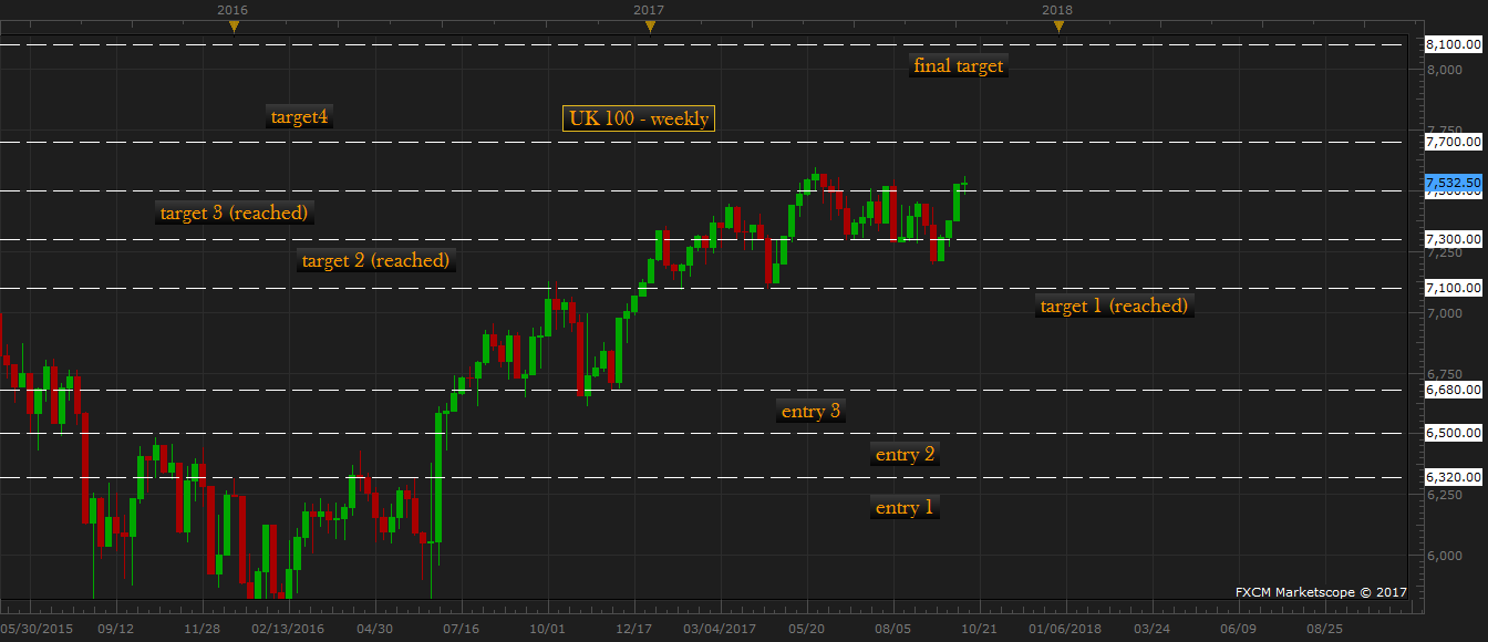 Since that review, the call hasn’t made much progress but the index consolidated. No new targets (7700, 8100) weren’t reached. This week the FTSE100 is once again testing the highs made in May and in this article, we would once again like to reiterate our commitment to the call with the final target around 8100.