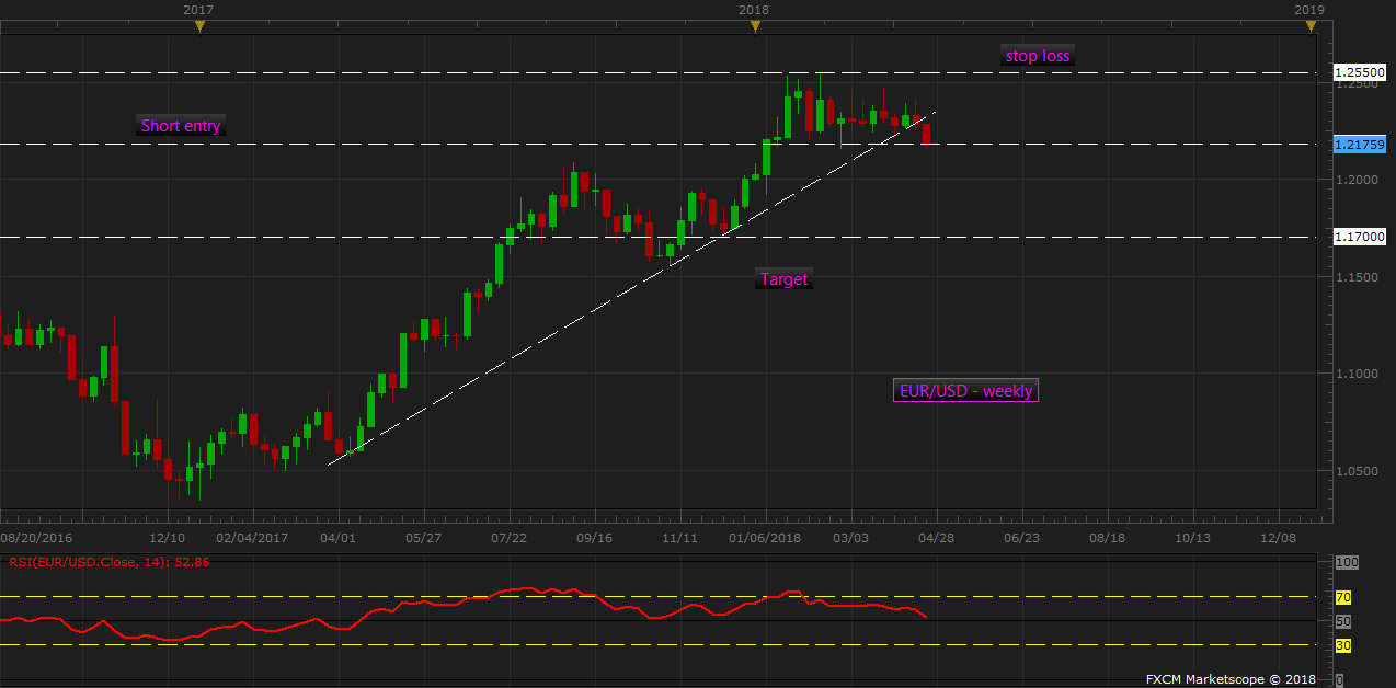 Since our last review in mid-April, where we suggested that the euro remains trapped in Bull/Bear fight and it is vital for the bears to take out key support around 1.216 area, the euro has declined and currently testing the key support as it trades around 1.217 area.