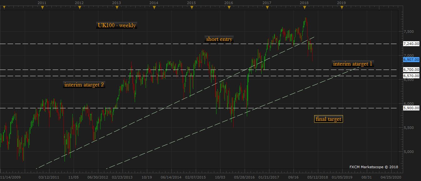 As global stocks selloff fathers pace, UK100 (CFD of FTSE100) declined further and currently trading at 6910 area. We would like to urge our readers to maintain short positions and in this article, we would like to add the following interim targets.