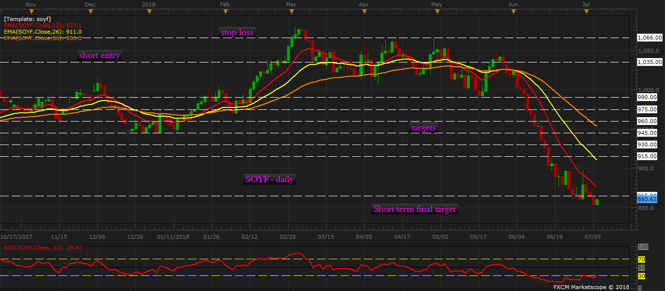 Soybean has reached all of our bearish targets amid trade tensions between the United States and China, which happens to be the biggest consumer of Soybeans and biggest importer of U.S. Soybeans. You can check the call here, https://www.econotimes.com/FxWirePro-Call-Review-Soybean-short-target-further-extended-as-sell-off-intensifies-on-trade-tensions-and-bumper-production-1371629
