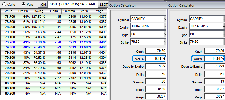 The implied volatility of 1W CADJPY ATM contracts is just 9.19% but likely to spike at 14.24% during 2w expiry.