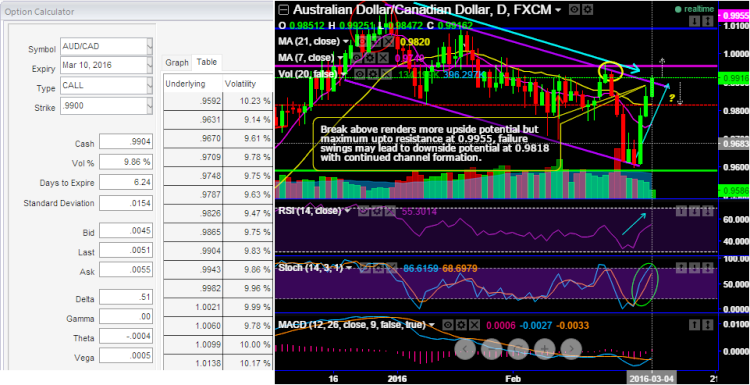 After going through the above article on technical reasoning, with IVs of 1W ATM calls at 9.86% we hope what the uptrend is intended to be at this juncture and if you compare the prevailing price of AUDCAD with the recent swings it would be more convincing.