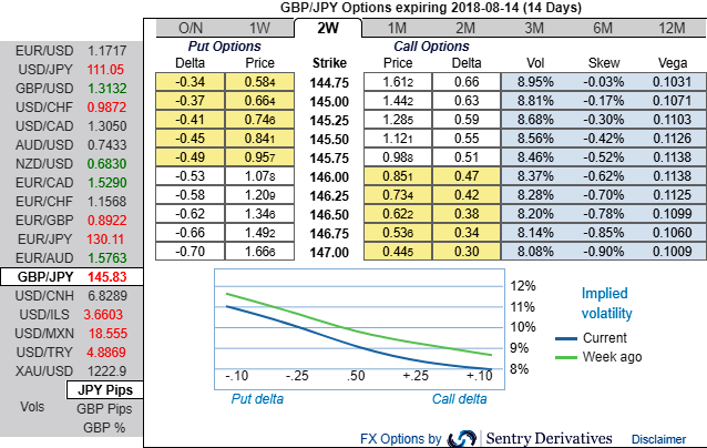 Before we proceed further, please be noted that the positively skewed IVs of 2m tenors signify the hedgers’ interests to bid OTM put strikes upto 142 levels, whereas 2w skews are well balanced either side (refer above nutshells evidencing IV skews). As you could observe GBPJPY forward rates across different tenors (refer above nutshell), these derivatives instruments indicate bearish targets of this pair.