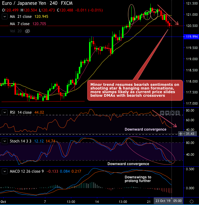 The minor downtrend resumes bearish sentiments on shooting star and hanging man formations at 120.862 and 121.084 levels respectively. For now, extension of slumps seem to be most likely as these bearish pattern candlesticks coupled with the current price sliding below SMAs with bearish SMA & MACD crossovers.
