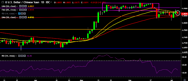 We prefer to take short position on USD/CNY around 6.8720, stop loss at 6.8820 and target of 6.8486.