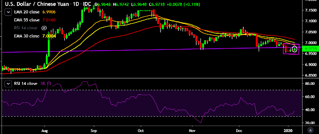 We prefer to take long position on USD/CNY around 6.9660, stop loss at 6.9590 and target of 6.9867/6.9957.