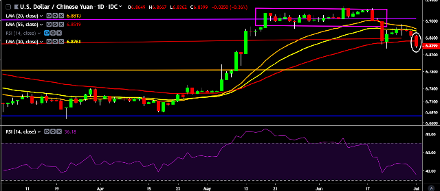 We prefer to take short position on USD/CNY around 6.84, stop loss at 6.8783 and target of 6.8210/6.80.