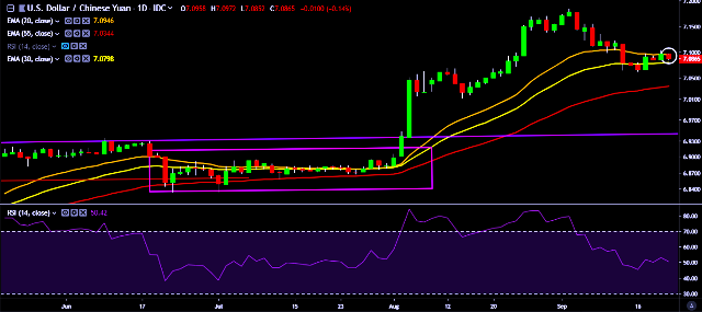 We prefer to take short position on USD/CNY around 7.09, stop loss 7.1050 and target of 7.0497/7.0108.