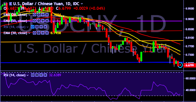 We prefer to take short position on USD/CNY only below 6.6727, stop loss at 6.70 and target of 6.6650/6.6413.