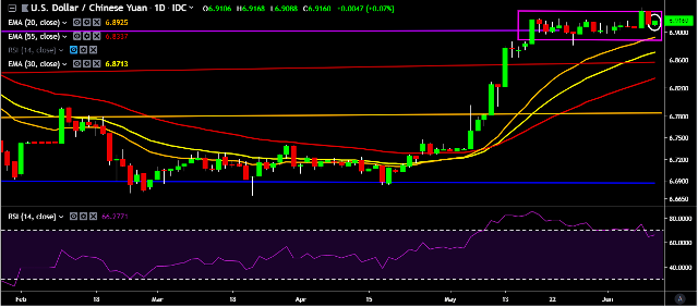 We prefer to take short position on USD/CNY only below 6.9056, stop loss 6.9297 and target of 6.8979/6.8628.