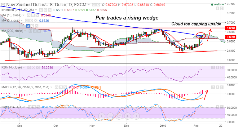 - NZD/USD has been trading a rising wedge pattern, currently at around 0.6690 levels.