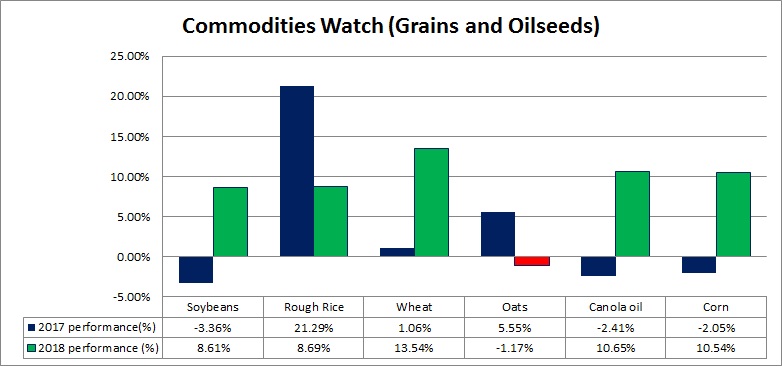 So far in 2018, Wheat has been the best performer with 13.5 percent gain, followed by Canola (10.6 percent), Corn (10.5 percent), Rough Rice (8.7 percent), and Soybeans (8.6 percent).