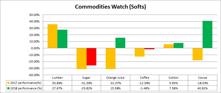 - So far in 2018, Cocoa has been the best performer with 40.8 percent gains, followed by Lumber (27.7 percent), Orange Juice (+15.6 percent), and Cotton (+5.95 percent).