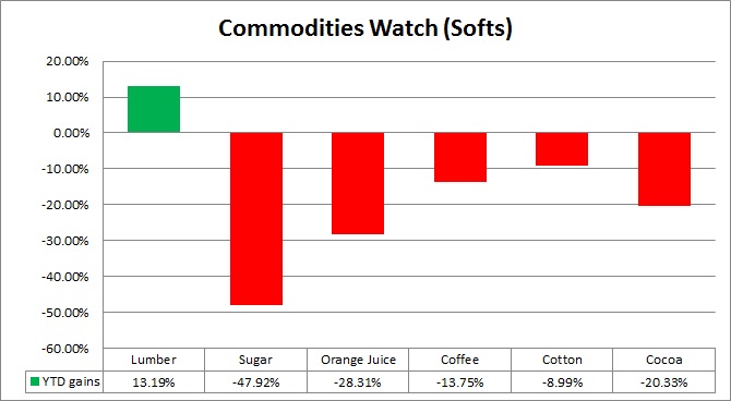 - The other members of the pack haven’t done so well so far this year, despite outperformance last year. Sugar is the worst performer with 48 percent loss, followed by Orange Juice (-28.3 percent), Cocoa (-20.3 percent), Coffee (-13.75 percent), and Cotton (-9 percent).