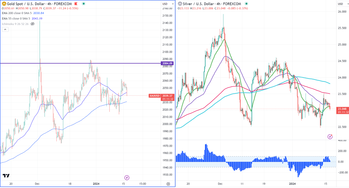 Gold pared most of its gains on board-based US dollar buying. The US dollar index gained momentum after upbeat US CPI data. US headline CPI rose above estimate to 3.4% YoY. US PPI fell 0.10% in Dec, compared to a forecast of 0.10%. Core PPI came unchanged at 0% vs the forecast of 0.20%. It hit a low of $2038.79 and is currently trading around $2040.07.