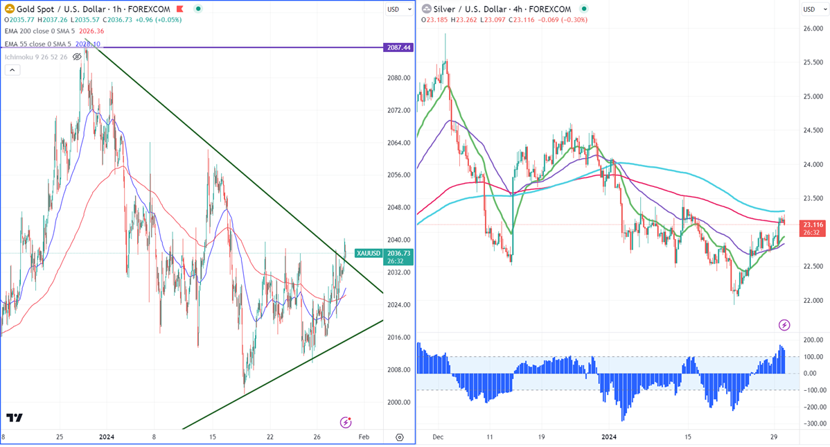 Gold trades higher despite the strong US dollar. The escalation of geo-political tension in the Middle East has increased the demand for safe-haven assets like Gold. The yellow metal hit a high of $2040.40 at the time of writing and is currently trading around $2036.68.