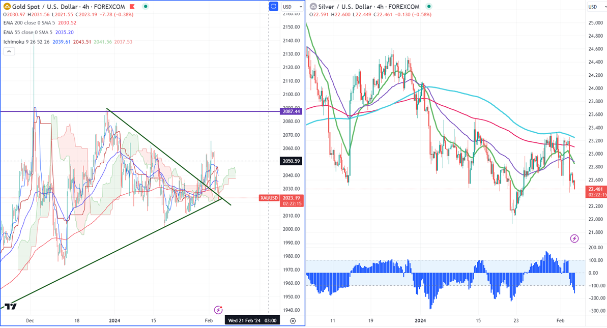 Gold pared most of its gains after stellar US jobs data. The US economy added 353000 jobs in Jan, compared to a forecast of 180000. Unemployment came in line with expectations of 3.70%. Wage inflation rose to 4.5% higher than the estimate of 4.1%. The chance of an early rate cut diminished after the US Non-farm payroll. The yellow metal hit a low of $2023 at the time of writing and is currently trading around $2023.52.