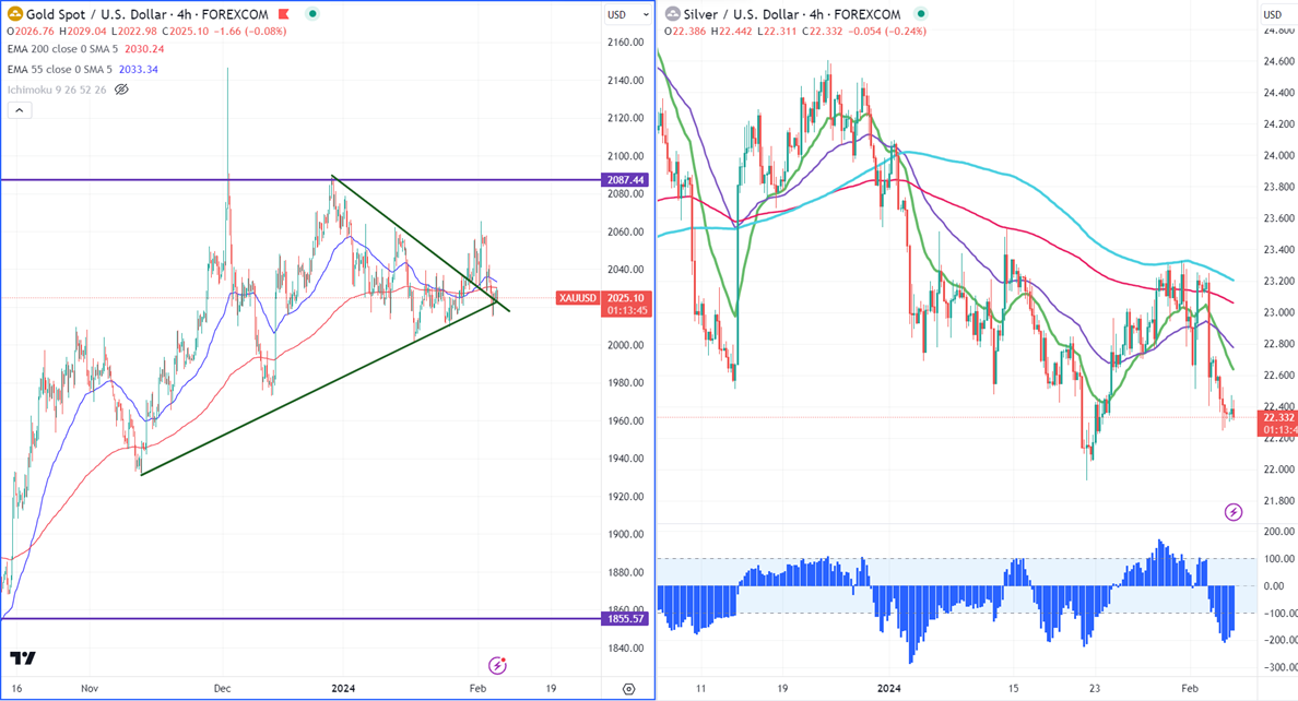 Gold traded flat after a sell-off of more than $50. The yellow metal was one of the worst performers in the past three days due to upbeat US economic data. US services PMI came at 53.4 in Jan, above the forecast of 52. Powell's hawkish comment in a CBS interview, "We just want some more confidence before we take that very important step of beginning to cut interest rates, "might decrease chance the of an early rate cut by the Fed. The yellow metal hit a low of $2014.97 yesterday and is currently trading around $2023.90.