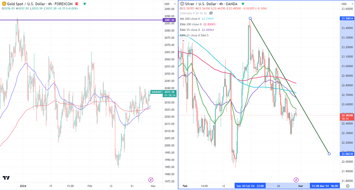 Gold showed a minor pullback, despite weak US GDP data. The United States' GDP grew at an annualized rate of 3.2% in Q4, missing market expectations of 3.3%. The yellow metal hit a high of $2037.92 at the time of writing and is currently trading around $2036.63.