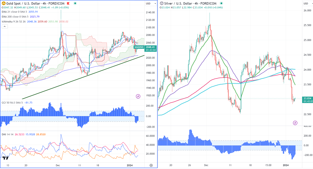 Gold lost its shine after less dovish FOMC minutes. It hit a low of $2030.69 and is currently trading around $2047. Minutes from FOMC's December meeting show that rates as likely at or near its peak and a further policy action depends on economic development. The meeting minutes did not give any clue about the timing of the rate cut.