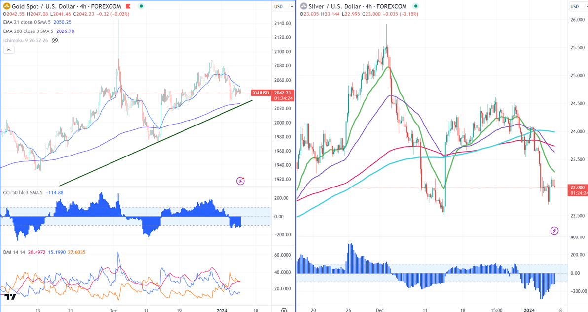Gold trades flat ahead of US Nonfarm payroll data. The US private sector rose by 164000 in Dec compared to a forecast of 115000. The number of people who have filed for unemployment benefits declined by 18000 to 202K the previous week vs.217K. It hit a low of $2030.69 and is currently trading around $2043.16.