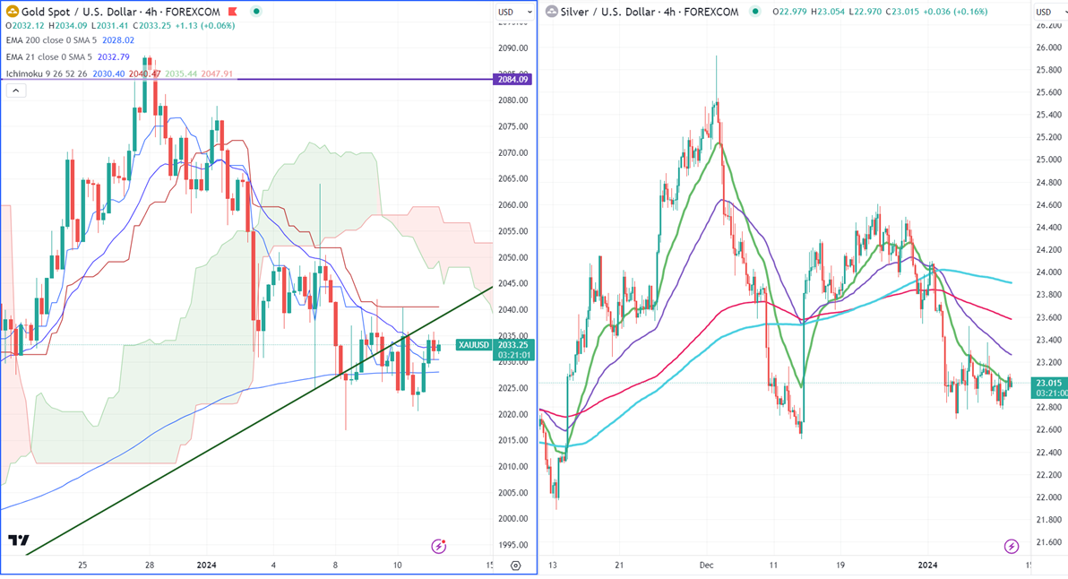Gold has been trading flat for the past three days. Markets eye US CPI data for further direction. US headline CPI is expected a minor jump to 3.2% from 3.1%. Annual core CPI is forecasted to decline from 4% to 3.8%. It hit a low of $2016 and is currently trading around $2032.68.