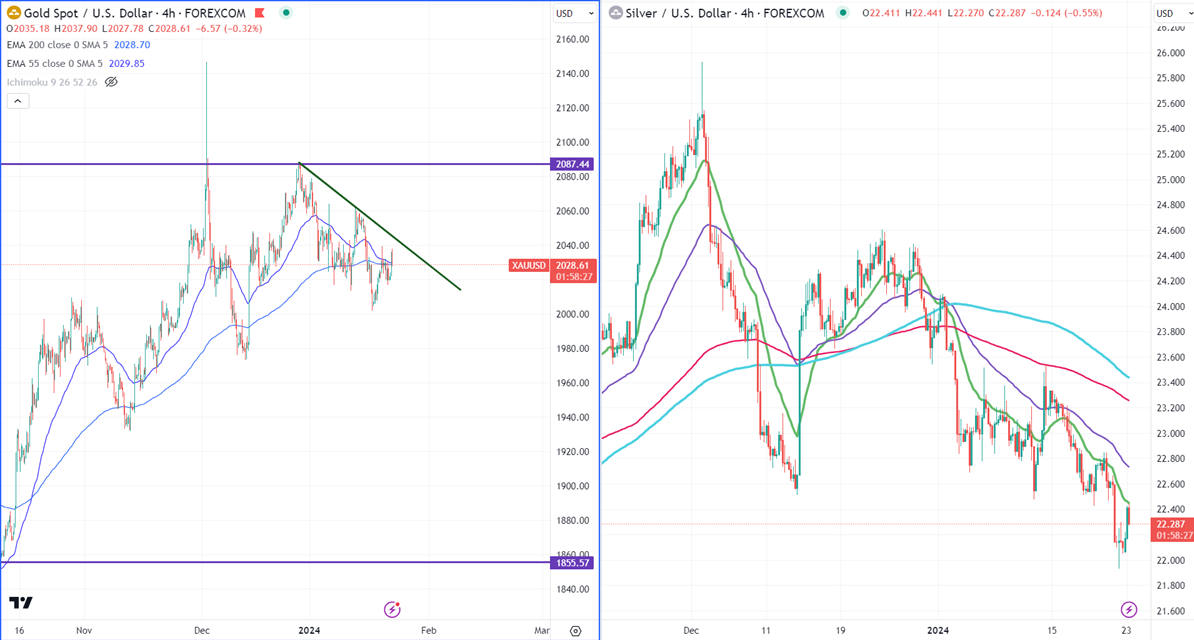 Gold has consolidated in a narrow range between $2001 and $2039.48 for the past five days. The yellow metal has declined for the past two months after hitting an all-time high of $2146. the hawkish comments and upbeat US economic data are pushing the US dollar index higher. The yellow metal hit a high of $2037.90 and is currently trading around $2028.9.