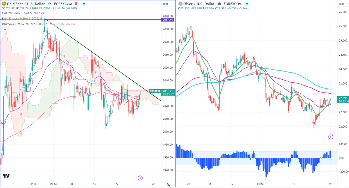 Gold trades in a narrow range between $2037.90 and $2009.40 for the past four days. US Advance GDP grew at a faster pace at 3.3%, compared to a forecast of 2%. US durable goods orders came unchanged in Dec. The Core PCE rose by 2.9% last month from 3.2% in Nov. The central bank kept its rates unchanged without making any changes in the policy statement. ECB President Lagarde said "The consensus around the table of the Governing Council was that it was premature to discuss rate cuts," The yellow metal hit a high of $2028 at the time of writing and is currently trading around $2027.64.