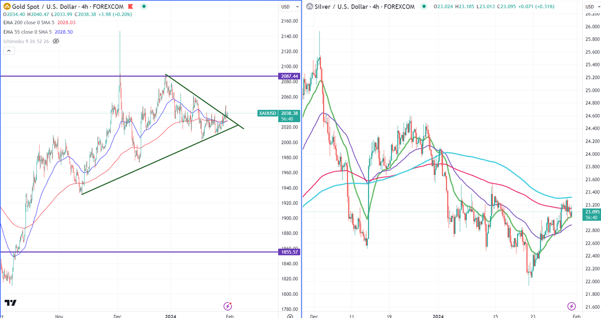 Gold trades are highly volatile ahead of US Fed monetary policy. The US fed is expected to keep rates on hold at 5.25%-5.50 %. Markets await the US Fed chairman's press conference for the exact timing of the rate cut. The escalation of geopolitical tension in the Middle East also supports safe-haven assets like gold. The yellow metal hit a high of $2048.63 yesterday and is currently trading around $2038.53.